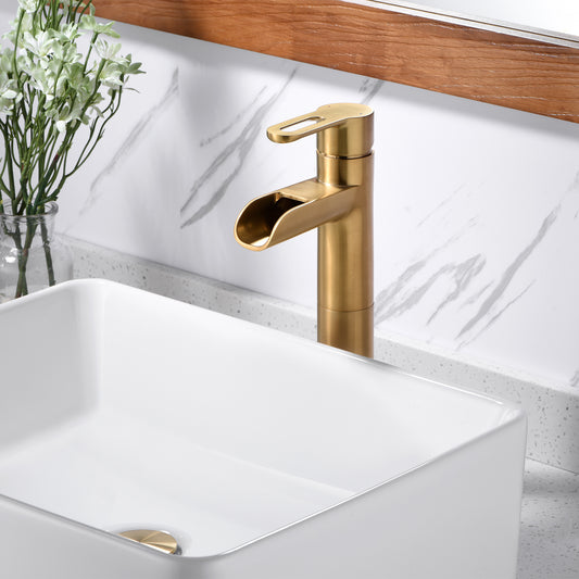 VividFall BSH16-TG Waterfall Single Hole Single Handle Bathroom Vessel Sink Faucet with Drain in Brushed Gold