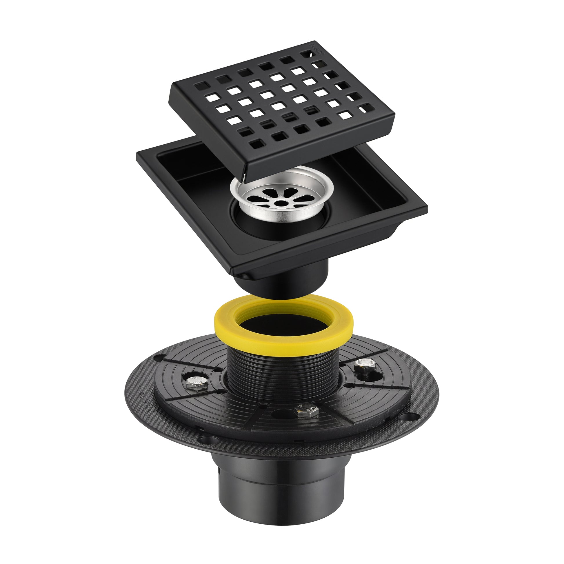 • Includes drain grate, drain body, threaded adapter, rubber adapter, drain base, lift key and strainer basket