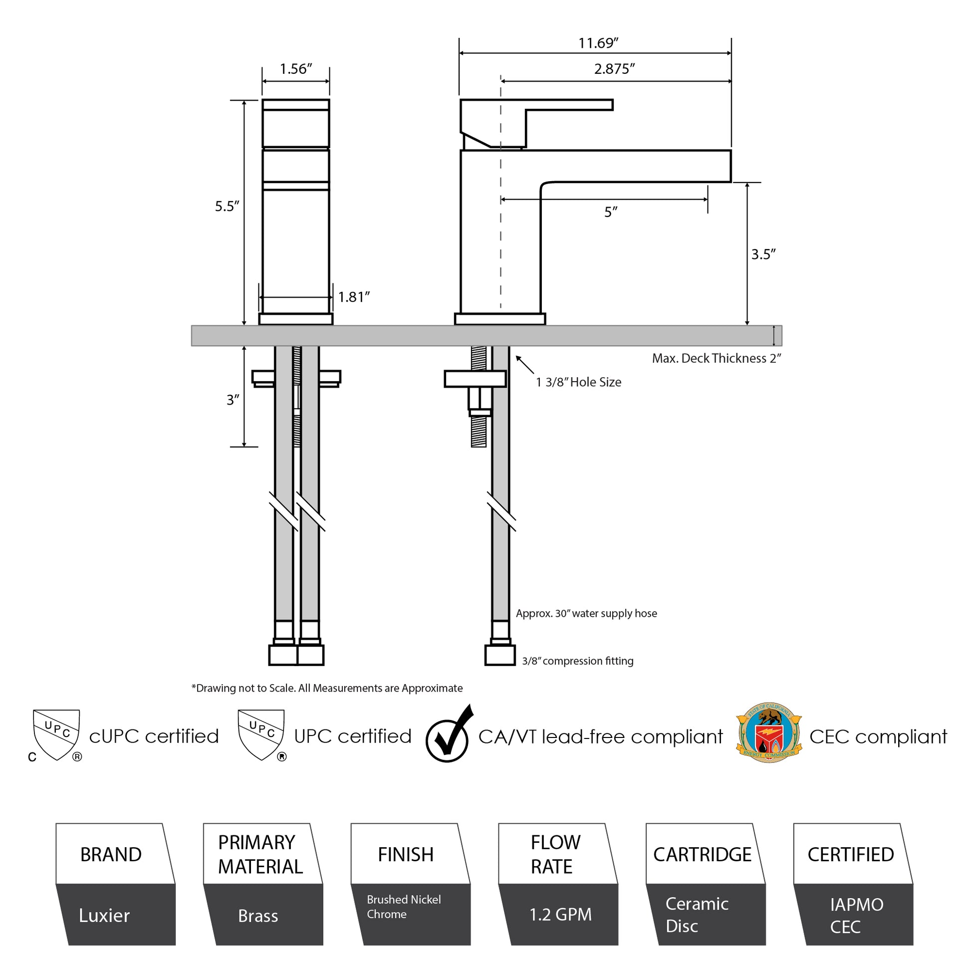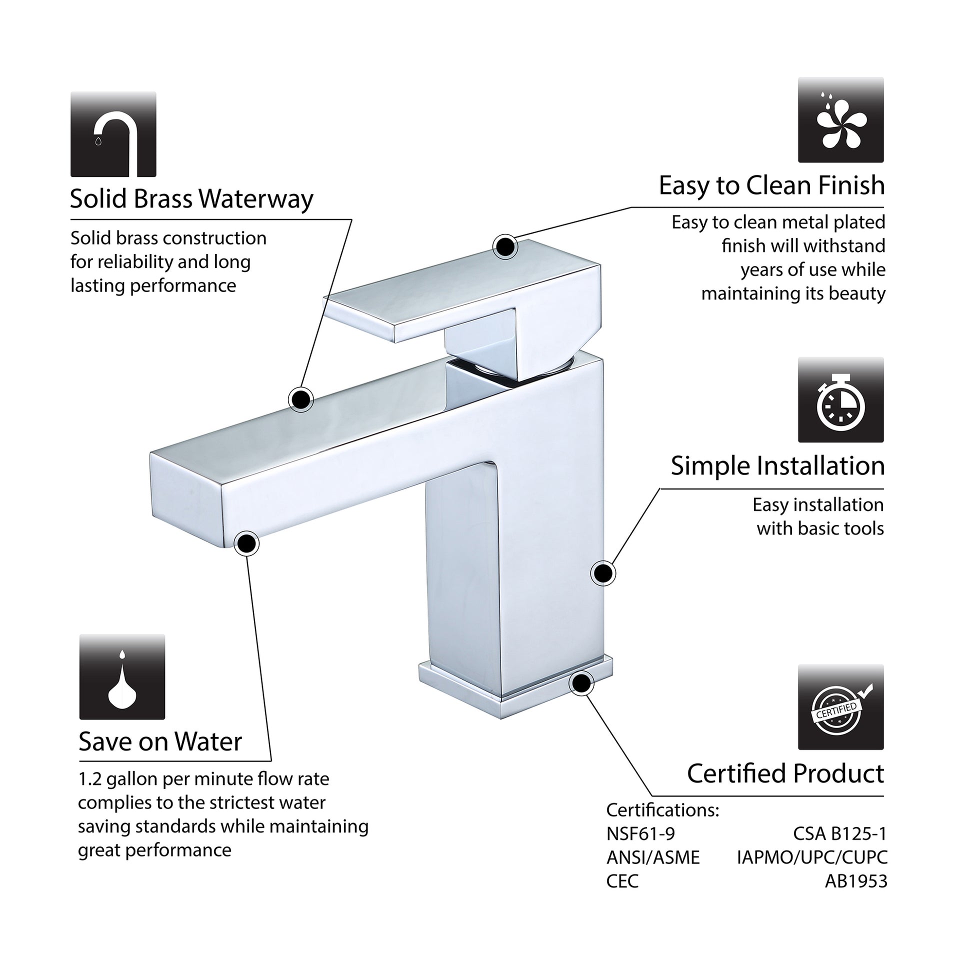 • Certifications and Listings: ADA, ASME A112.18.1 / CSA B125.1, CEC, UPC, cUPC, NSF, WaterSense